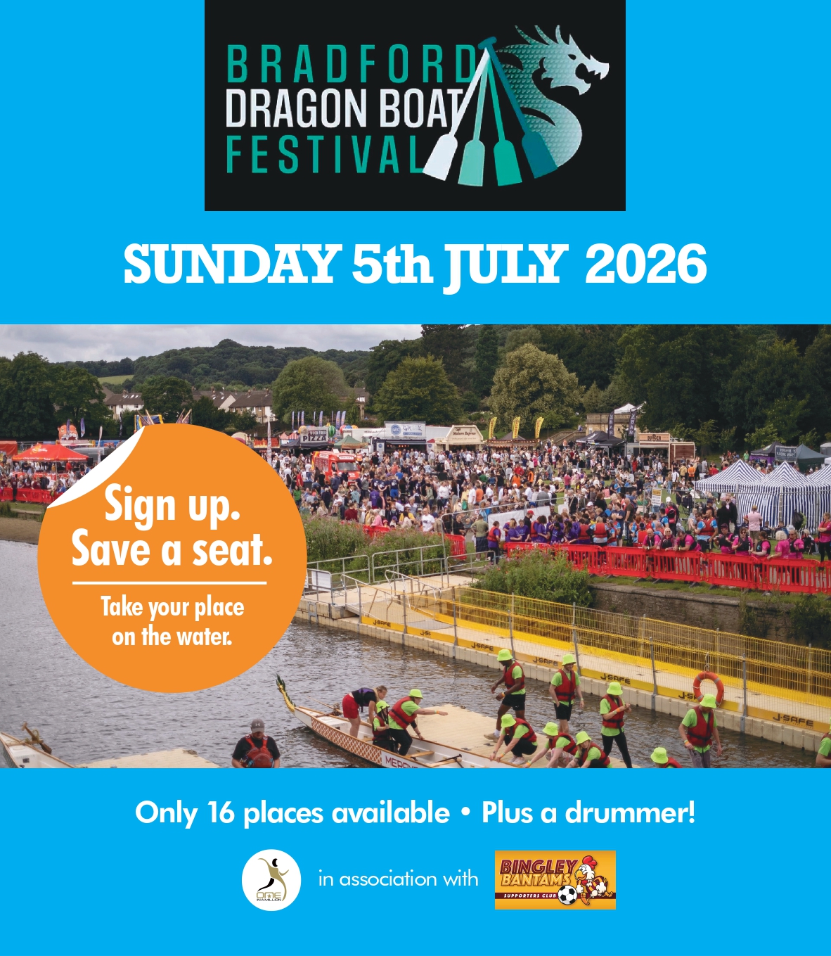 We’re calling all rowers, teammates and thrill-seekers… are you ready to take your seat, hit the water and claim the title? Join One In A Million Charity in association with Bingley Bantams on Sunday 5th July at the Bradford Dragon Boat Festival in Roberts Park, Saltaire.